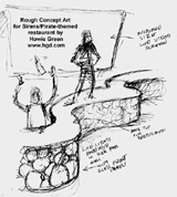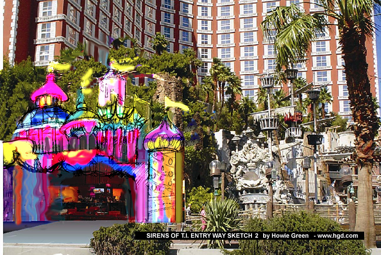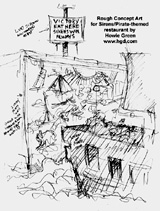 I present these sketches and rough concept artwork to show how my creative process begins. These are rough pencil sketches to start the discussion of what this Pirate / Siren themed restaurant at Treasure Island Hotel in Las Vegas might look like. The space was empty and was planned to be themed to take advantage of the Sirens of T.I. live action thrill and fireworks show that takes place outside the hotel several times a night. The show draws huge crowds and the initial restaurant idea was to capitlize on the Sirens theme and develop an environment that was to be their treasure house and hideout that they would return to after capturing a ship and robbing it of all the treasure. So, the interior would be a G-rated Guilded Palace of Treasure and Pleasure... but fun for the whole family.
